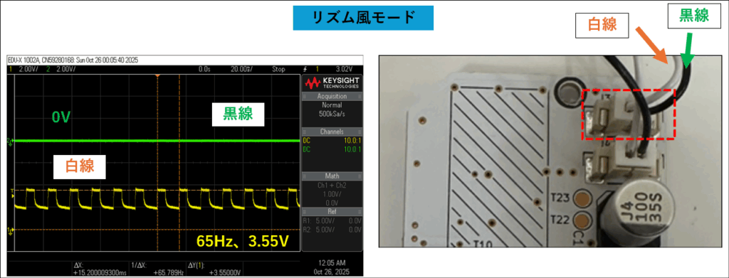 リズム風は、白線側がPWM出力で、定期的に出力電圧が0V⇔PWMとなっていた。